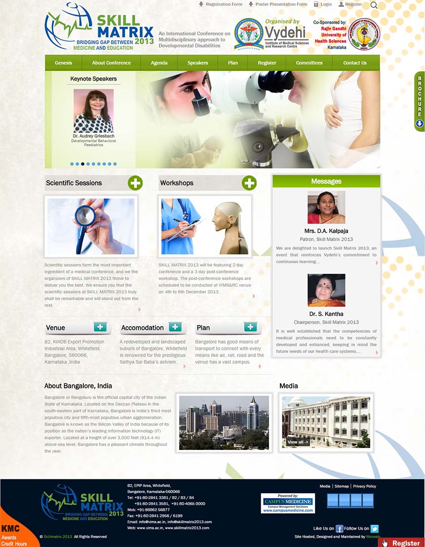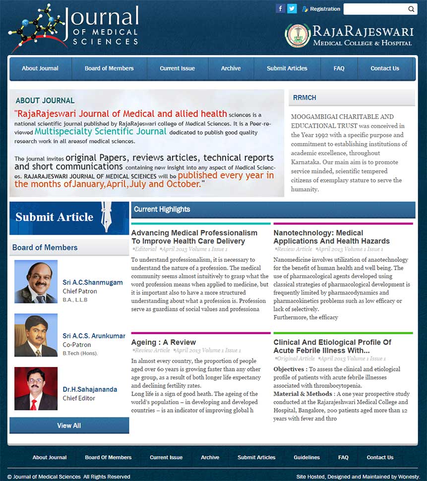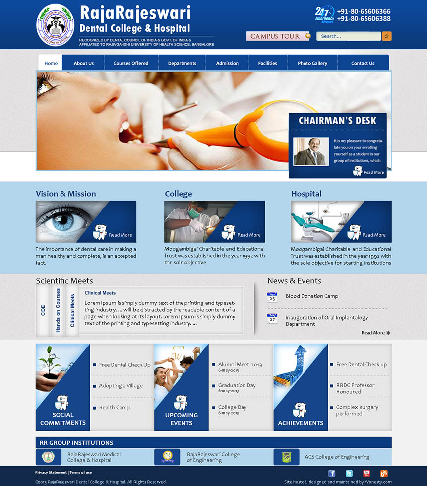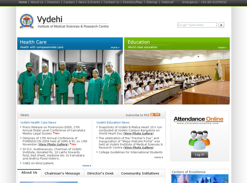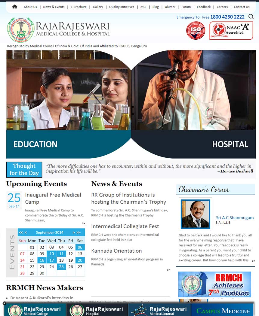 World Class websites for Campuses A Premier Medical College and Hospital CBSE affiliated co-ed school An International Conference bridging the gap between Medicine and Education Engineering College at par excellence Overall Oral health and hygiene International Conference in the realm of medical education Explore the new world of Healthcare and Education Prevention, Early Detection and Cancer Education A special centre for those in need of special care Provide congenial academic ambience First class creative design and efficient development. Professional Medical Sciences Journal Imparting engineering education Functioning Across all verticals E-Enabling your Engineering Campus Medical College & Hospital VHIRE4U team comprises of highly competent consultants with expertise and passion in recruitment and selection. A premiere hospital situated in the heart of Bangalore city Academic Website with excellent features Nursing Institution with cool look and feel