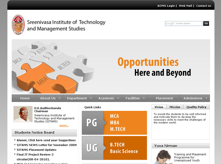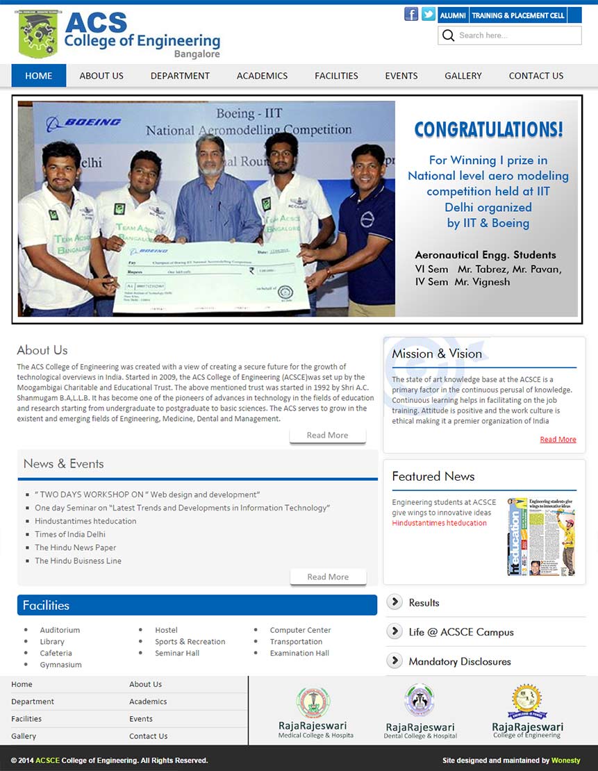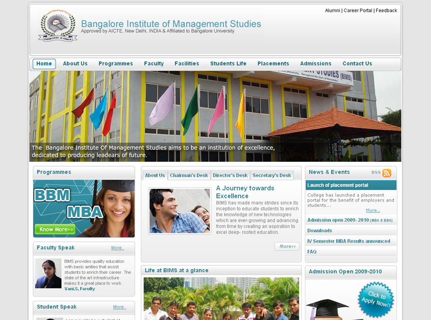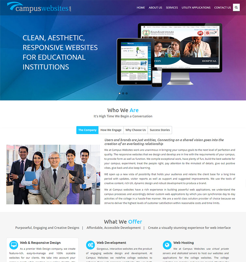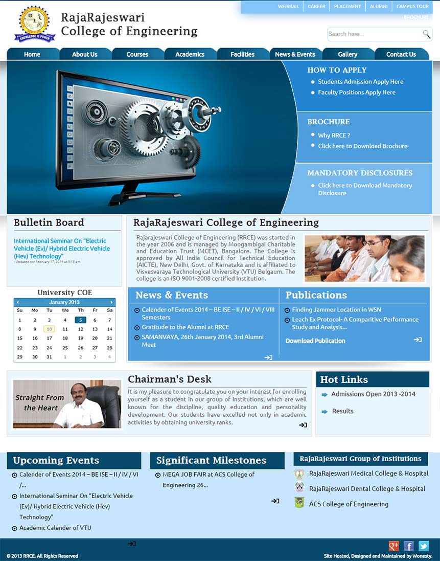 World Class websites for Campuses A Premier Medical College and Hospital CBSE affiliated co-ed school An International Conference bridging the gap between Medicine and Education Engineering College at par excellence Overall Oral health and hygiene International Conference in the realm of medical education Explore the new world of Healthcare and Education Prevention, Early Detection and Cancer Education A special centre for those in need of special care Provide congenial academic ambience First class creative design and efficient development. Professional Medical Sciences Journal Imparting engineering education Functioning Across all verticals E-Enabling your Engineering Campus Medical College & Hospital VHIRE4U team comprises of highly competent consultants with expertise and passion in recruitment and selection. A premiere hospital situated in the heart of Bangalore city Academic Website with excellent features Nursing Institution with cool look and feel